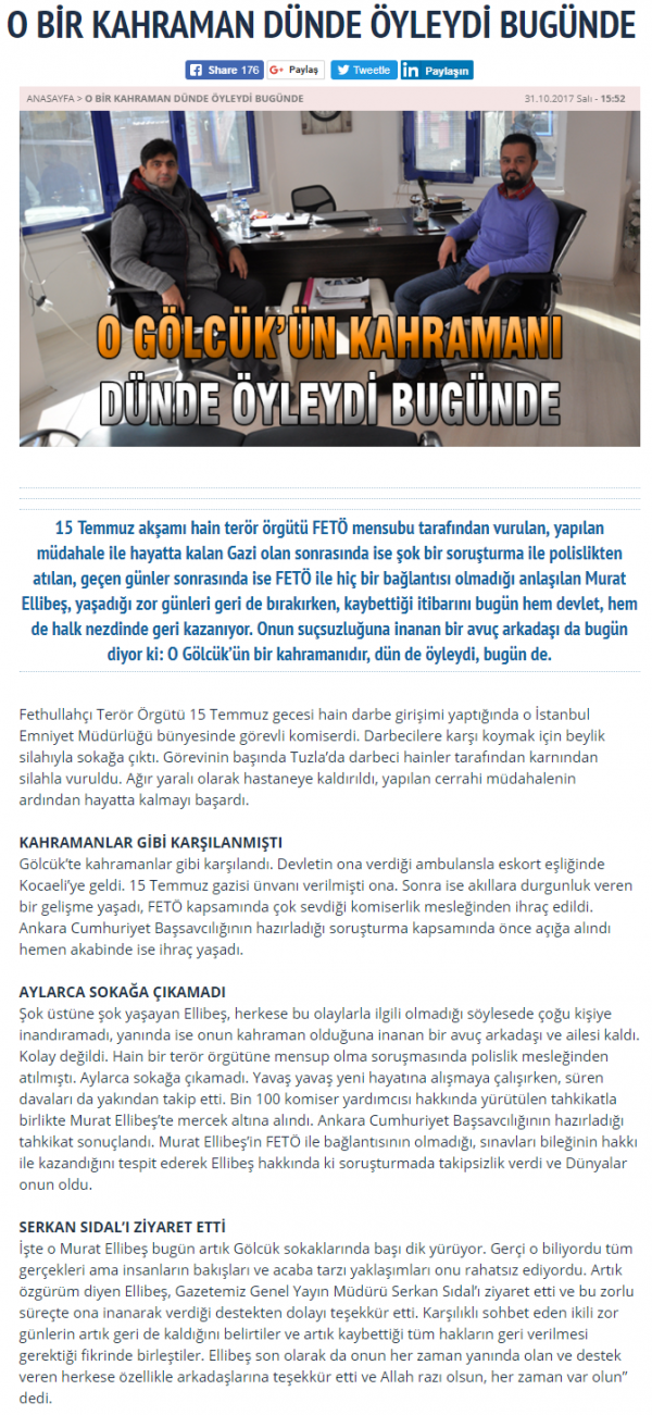 15 Temmuz akşamı hain terör örgütü FETÖ mensubu tarafından vurulan, yapılan müdahale ile hayatta kalan Gazi olan sonrasında ise şok bir soruşturma ile polislikten atılan, geçen günler sonrasında ise FETÖ ile hiç bir bağlantısı olmadığı anlaşılan Murat Ellibeş, yaşadığı zor günleri geri de bırakırken, kaybettiği itibarını bugün hem devlet, hem de halk nezdinde geri kazanıyor. Onun suçsuzluğuna inanan bir avuç arkadaşı da bugün diyor ki: O Gölcük’ün bir kahramanıdır, dün de öyleydi, bugün de.