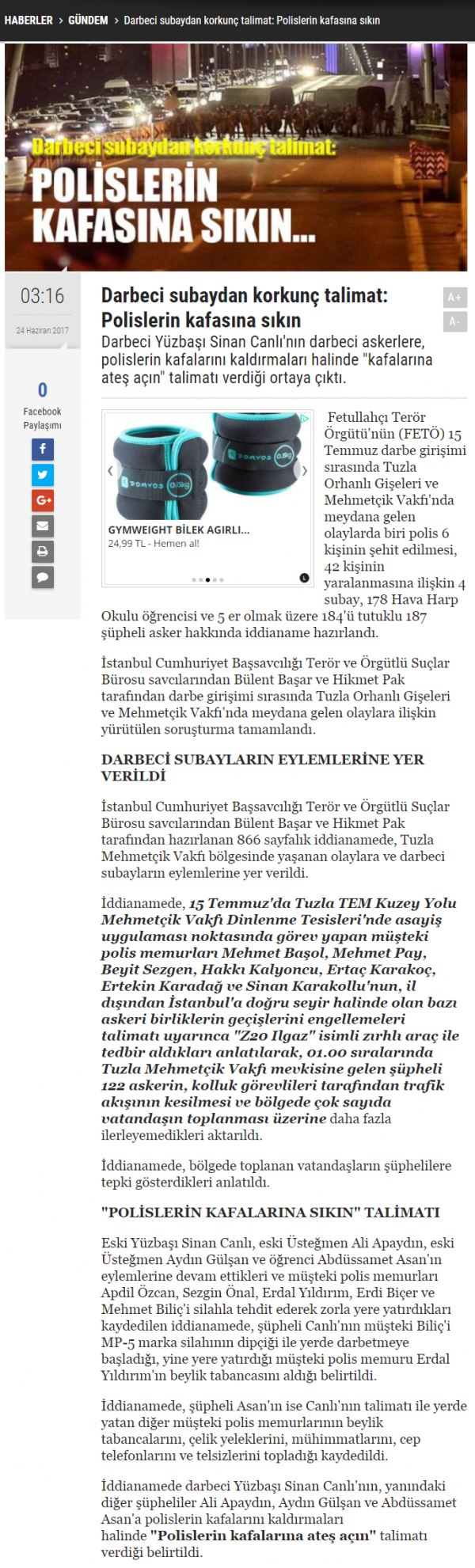İddianamede darbeci Yüzbaşı Sinan Canlı’nın, yanındaki diğer şüpheliler Ali Apaydın, Aydın Gülşan ve Abdüssamet Asan’a polislerin kafalarını kaldırmaları halinde “Polislerin kafalarına ateş açın” talimatı verdiği belirtildi.
